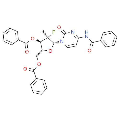| English Synonym: | PSI-6130 derivative;Cytidine, N-benzoyl-2'-deoxy-2'-fluoro-2'-Methyl-, 3',5'-dibenzoate, (2'R)-;2'-Deoxy-2'-fluoro-2'- Methyl-N-(phenylcarbonyl) cytidine;(2'R)-N-Benzoyl-2'-deoxy-2'-fluoro-2'-Methylcytidine 3',5'-dibenzoate;3',5'-O-4-Tribenzoyl-2'-deoxy-2'-fluoro-2'-C-Methylcytidine;(2R,3R,4R,5R)-5-(4-Benzamido-2-oxopyrimidin-1(2H)-yl)-2-((benzoyloxy)methyl)-4-fluoro-4-methyltetrahydrofuran-3-yl benzoate;(2'R)-N-Benzoyl-2'-deoxy-2'-fluoro-2'-methylcytidine 3',5'-dibenzoat;4-(Benzoylamino)-1-[5-O-benzoyl-2-deoxy-2-fluoro-2-methyl-3-O-(ph enoxycarbonyl)-β-D-xylofuranosyl]-2(1H)-pyrimidinone;N-4,3',5'-tri-O-benzoyl-2'-deoxy-2'-fluoro-2'-C-methylcytidine |